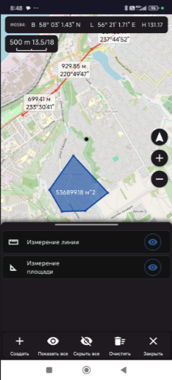 В программе можно выполнять измерение длин линий, углов направлений, площадей.