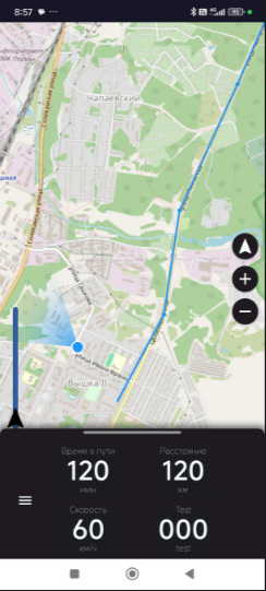 В ПО Странник можно прокладывать маршруты и осуществлять навигацию по ним. При езде по маршруту отображается скорость, направление, оставшееся время, расстояние до конца маршрута.